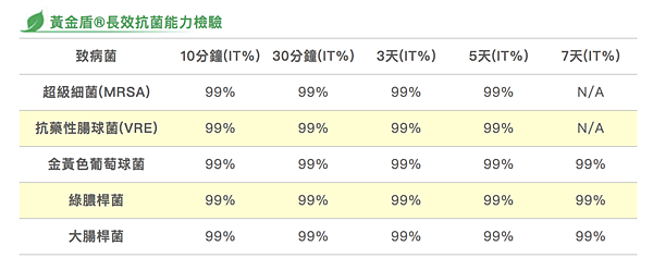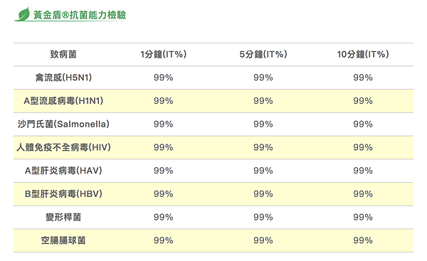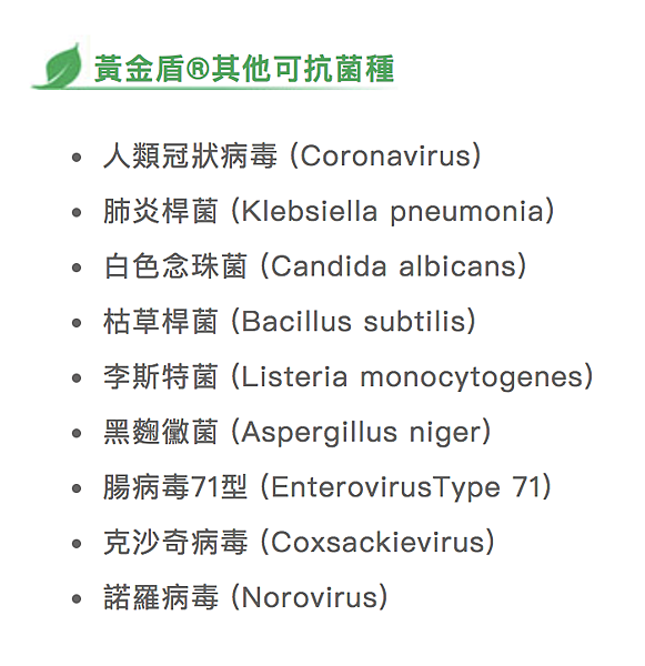 黃金盾®對於大腸桿菌、空腸腸球菌、金黃色葡萄球菌、綠膿桿菌有極佳效果,抗菌力高達99.9%。全台灣家長們聞之色變的諾羅病毒、H1N1、大腸桿菌、腸病毒等等都被黃金頓盾有效的拒於門外!除此之外,其實黃金盾能夠有效抵抗的菌種有這麼多!!!!