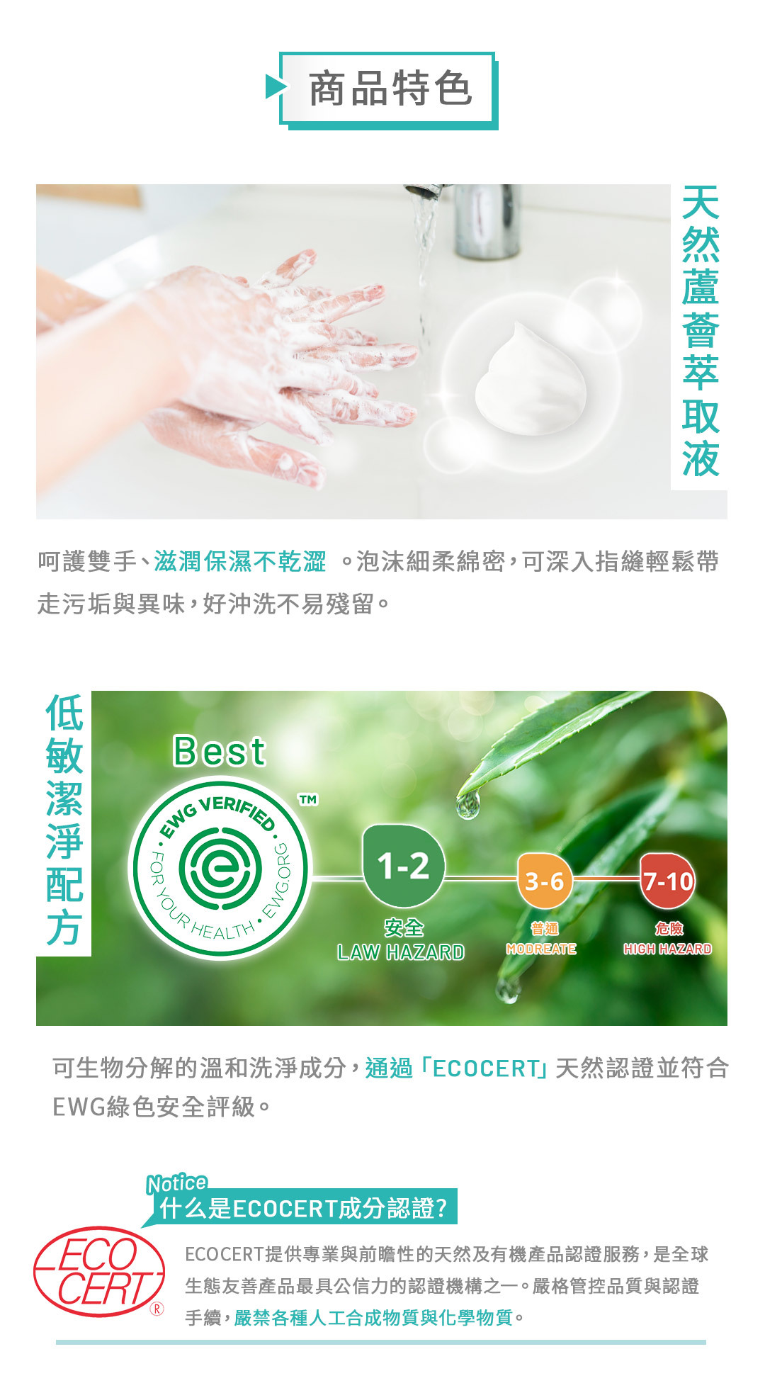 🌱蘆薈萃取:深層保濕,洗後雙手柔嫩不乾澀