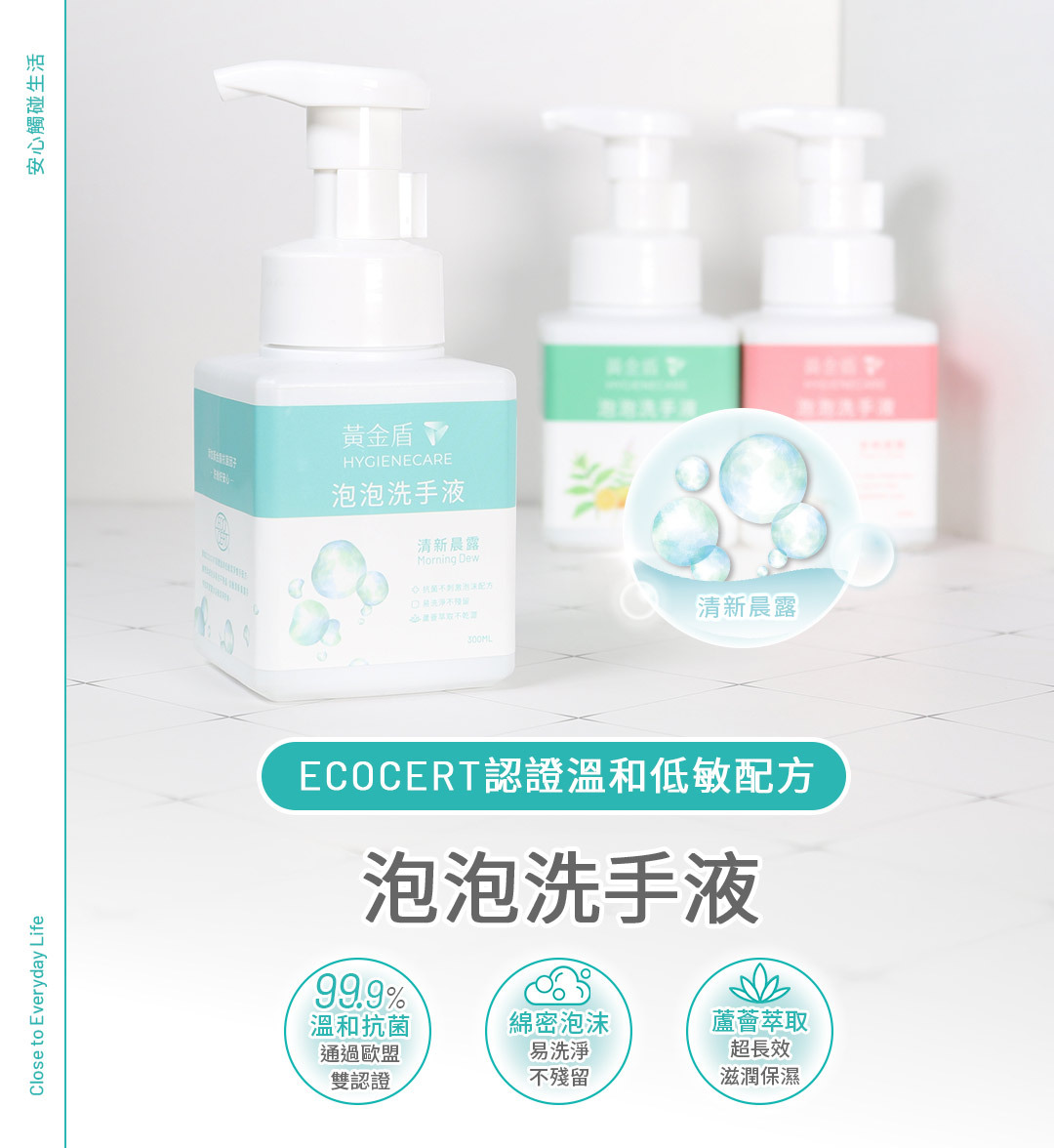 黃金盾泡泡洗手液嚴選天然植萃成分,層層呵護每次的洗手體驗: