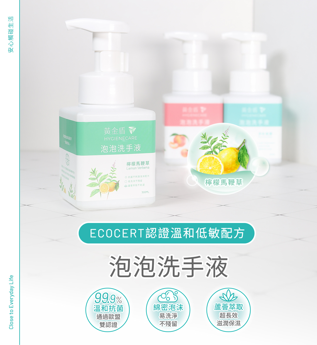 黃金盾泡泡洗手液嚴選天然植萃成分,層層呵護每次的洗手體驗: