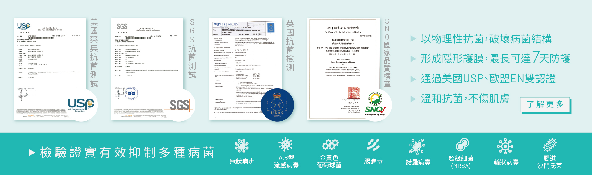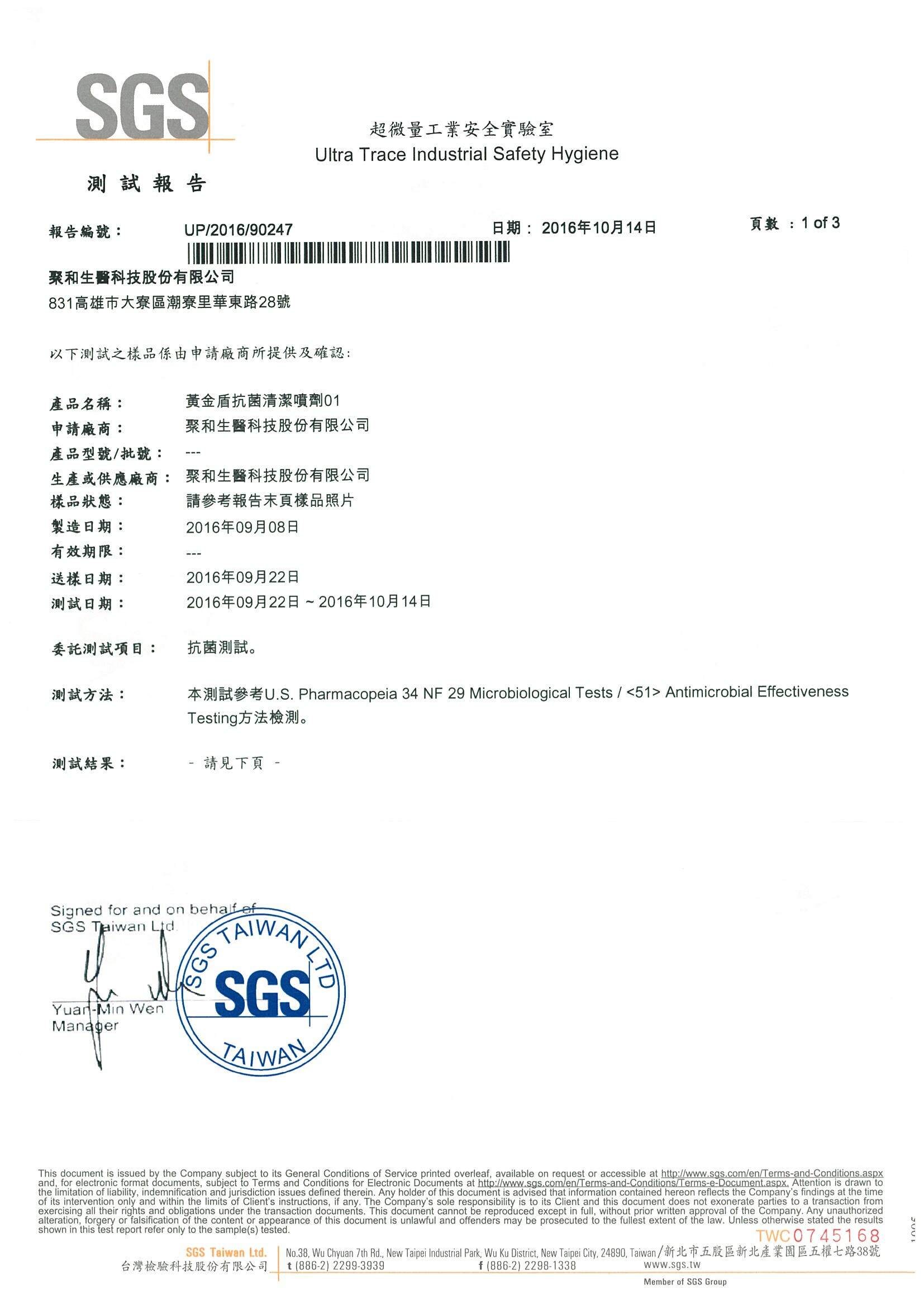 黃金盾®抗菌清潔噴劑01、07、乾洗手通過SGS測試,包含大腸桿菌(Escherichia coli)、金黄色葡萄球菌(Staphylococcus aureus)、綠膿桿菌(Pseudomonas aeruginosa)、白色念珠菌(Candida albicans)、黑麴菌(Aspergillus brasiliensis)