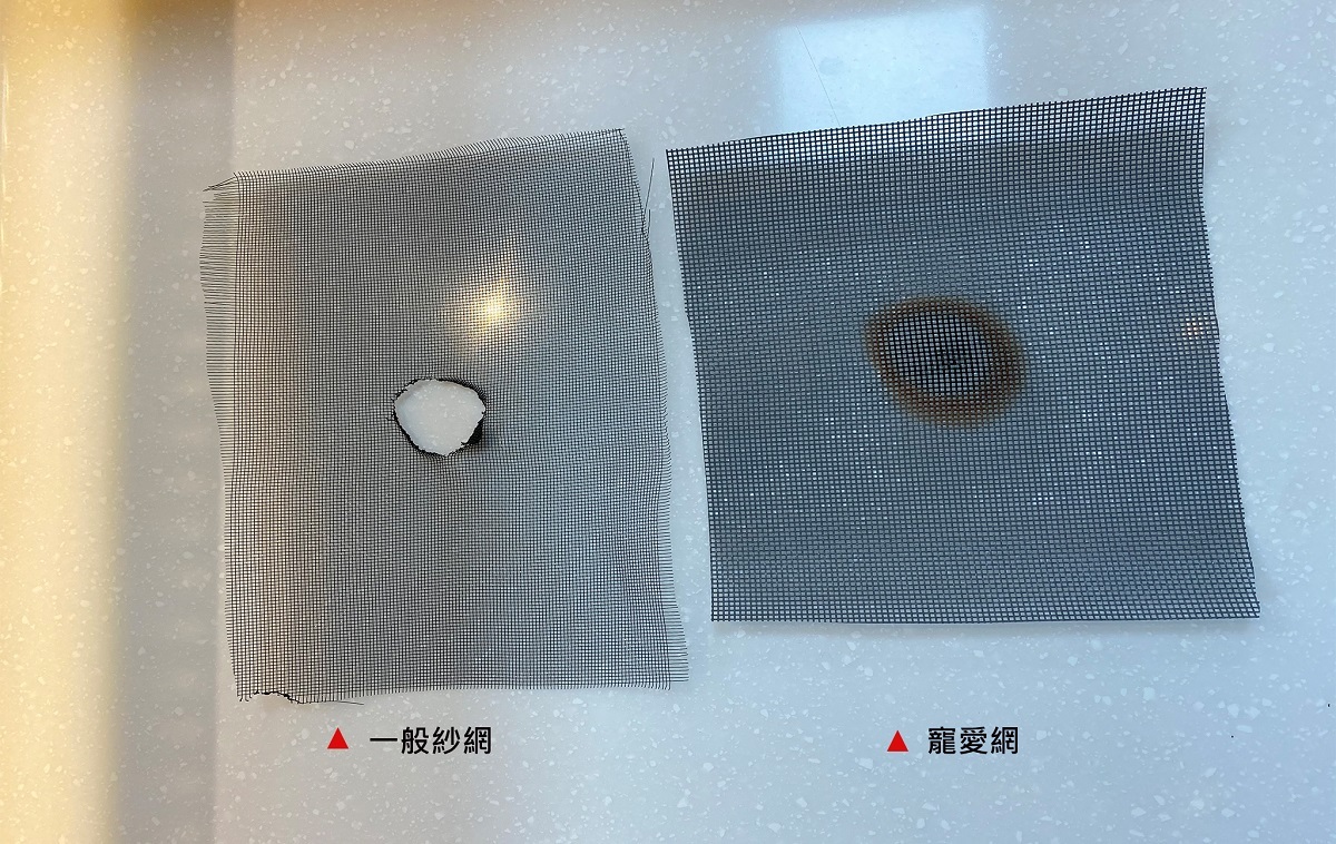 此外,寵愛網玻璃纖維材質還具有防火功能,耐高溫且不易燃燒,被拜拜香、香菸燒到不會輕易移位或綻開。火燒後,寵愛網只會出現燒過的痕跡,沒有破洞且不會移位或整個綻開,對於居家安全更有保障。