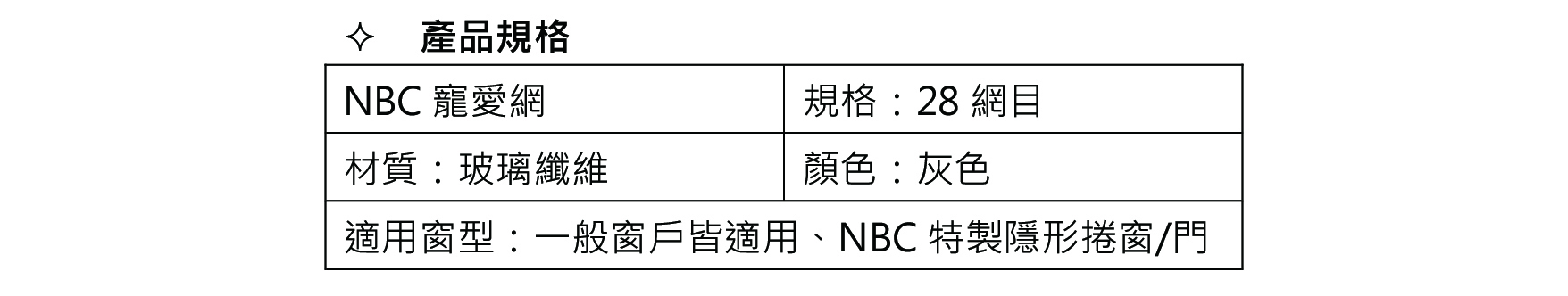 介紹一個超實用紗網-NBC寵愛網。NBC是日本紗網品牌,研發這款適合毛小孩的紗窗網,使用玻璃纖維為材料,玻璃纖維具有高彈性、高延展功能,耐用程度相對傳統紗網佳,能有效延長紗網使用期限,也能緩衝利爪用力抓的力度,減少對寵物指甲的傷害。