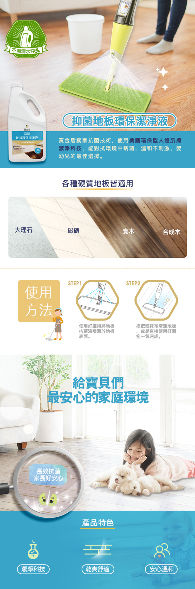 2.不需再用清水沖洗,地板快速回乾,長效抗菌潔淨。
