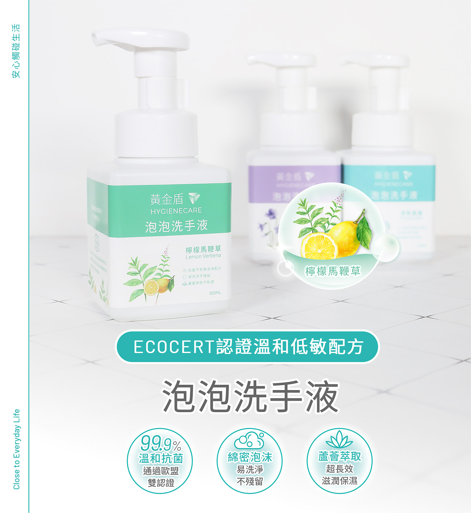 黃金盾泡泡洗手液嚴選天然植萃成分,層層呵護每次的洗手體驗:
