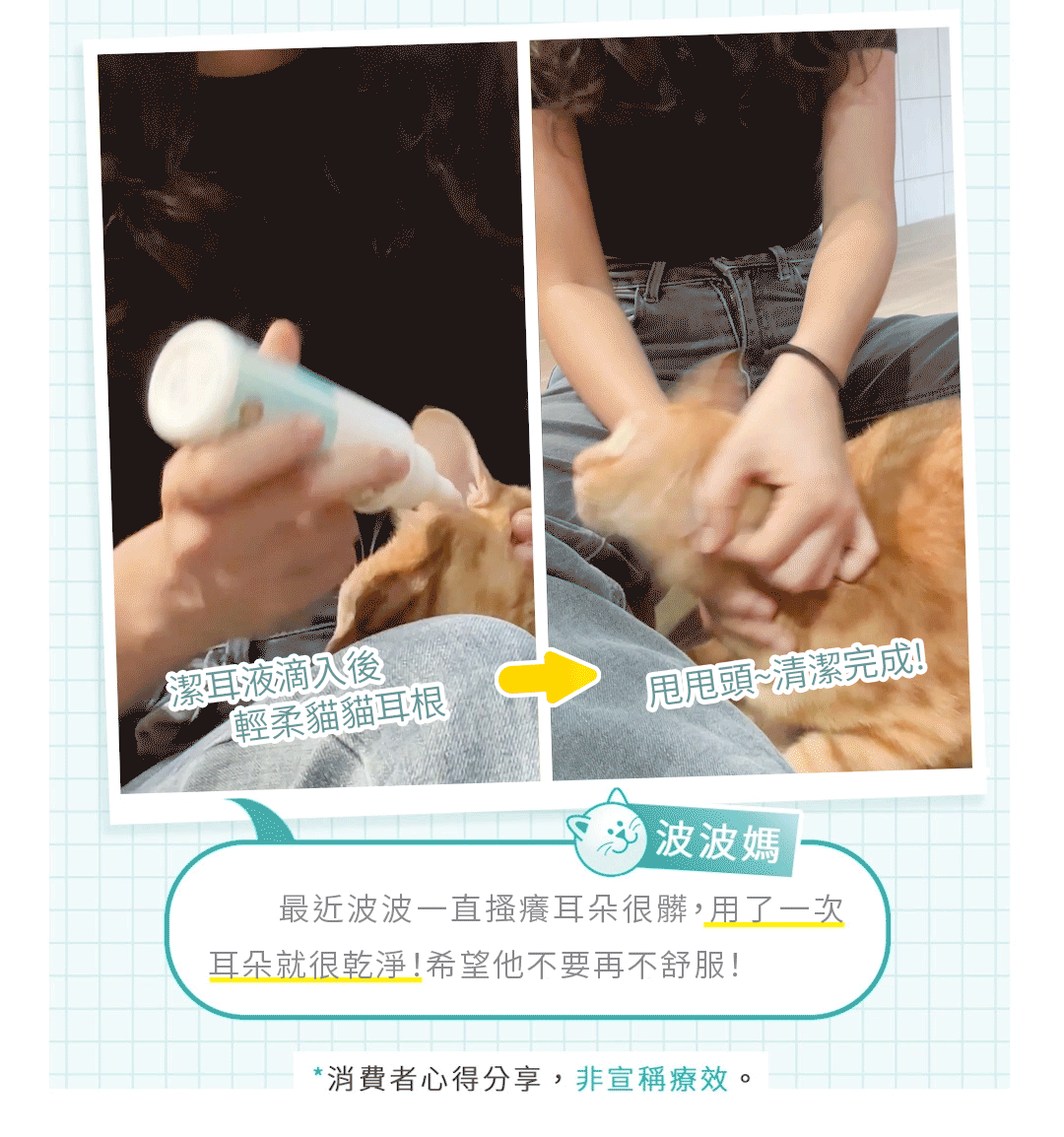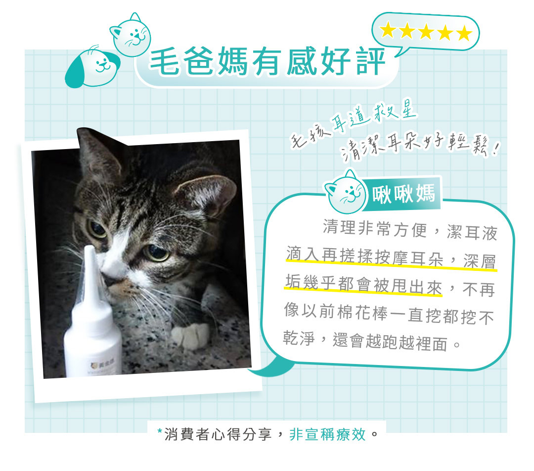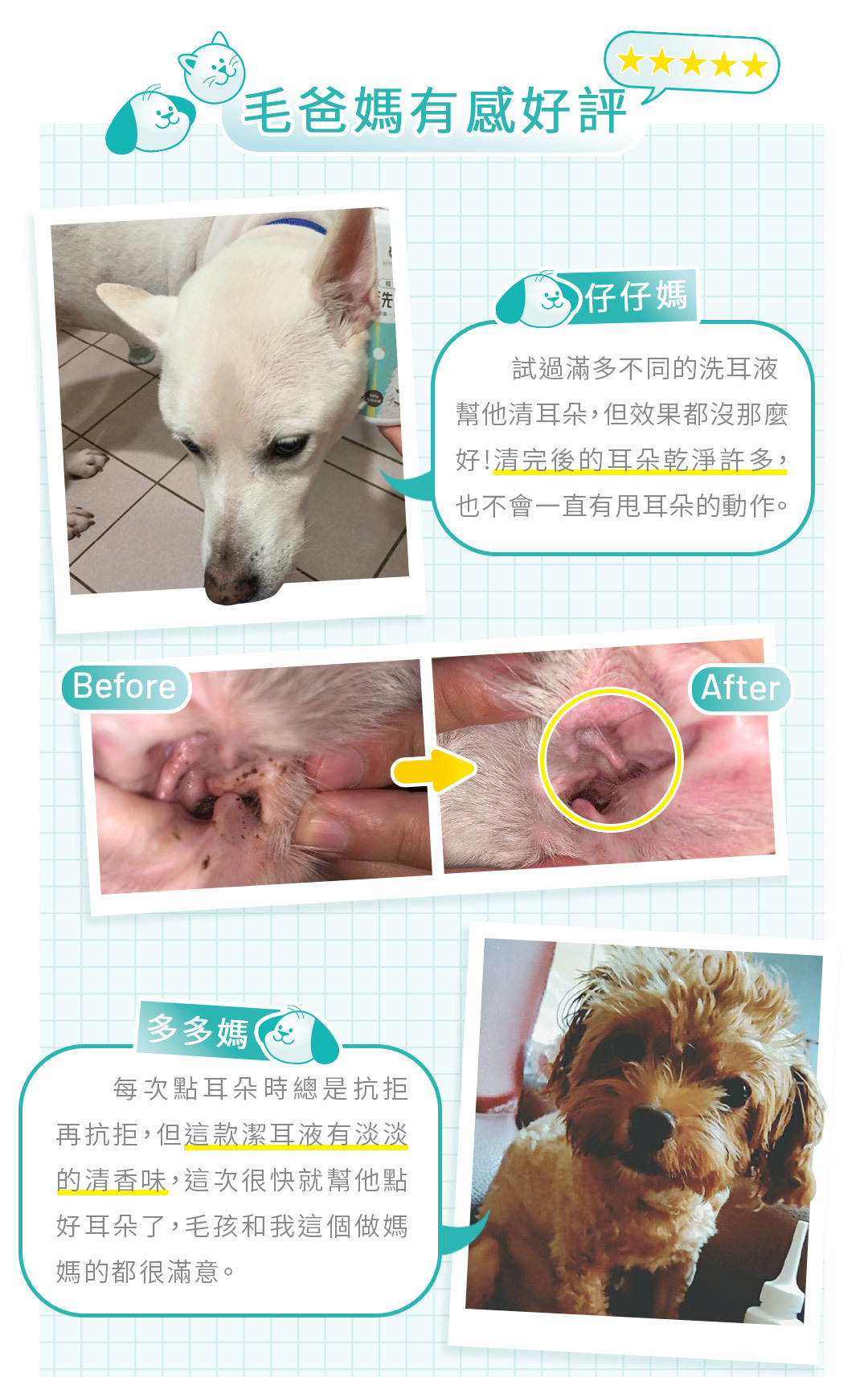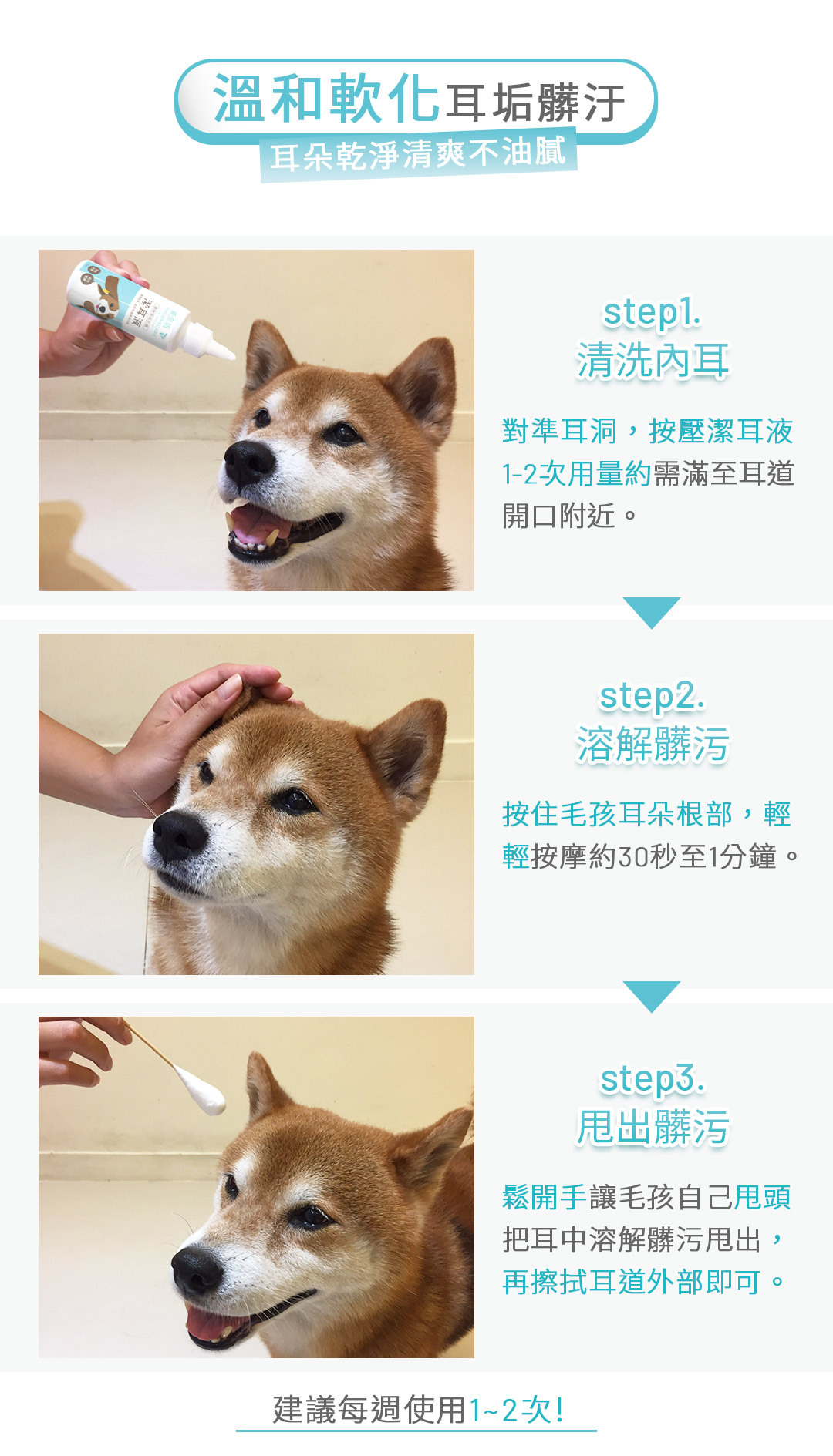 ►使用方法:1.對準耳洞,按壓1~2次潔耳液 2.輕輕按摩耳朵根部約1分鐘,讓髒污充分溶解 3.待毛孩將髒污或耳垢甩出後,再用乾淨的棉花棒或棉花球擦拭耳道外部,清除耳垢。