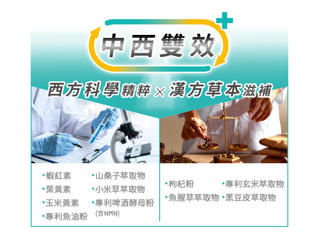 ►成分:水解蛋白、專利玄米萃取物、黑豆皮萃取物、蝦紅素、魚腥草萃取物、山桑子萃取物、枸杞粉、小米草萃取物、專利魚油粉、金盞花萃取物(含葉黃素)、專利流行鏈球菌發酵物(含透明質酸鈉)、專利啤酒酵母粉(含β-菸醯胺單核苷酸(NMN))、麥芽糊精。