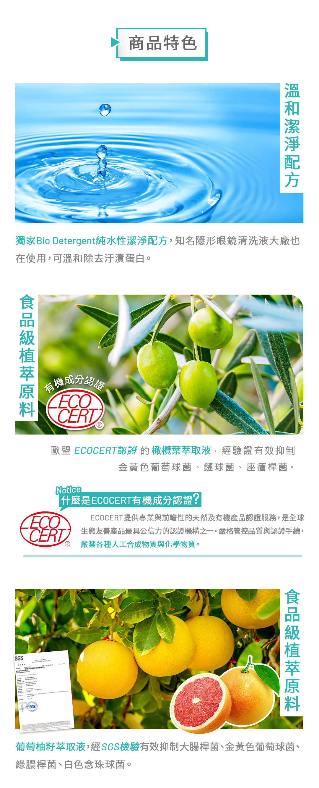 ►主要成分:水、青柚萃取精油、葡萄柚籽萃取液、橄欖葉萃取液、生物型界面活性劑(Bio-Detergent)、有機矽氧烷銨鹽。