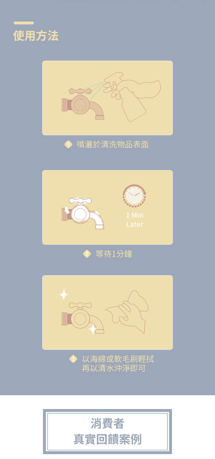 ►使用方法:噴灑於清洗物體表面,等待1分鐘後以海綿或刷子刷洗,再以清水沖淨即可。