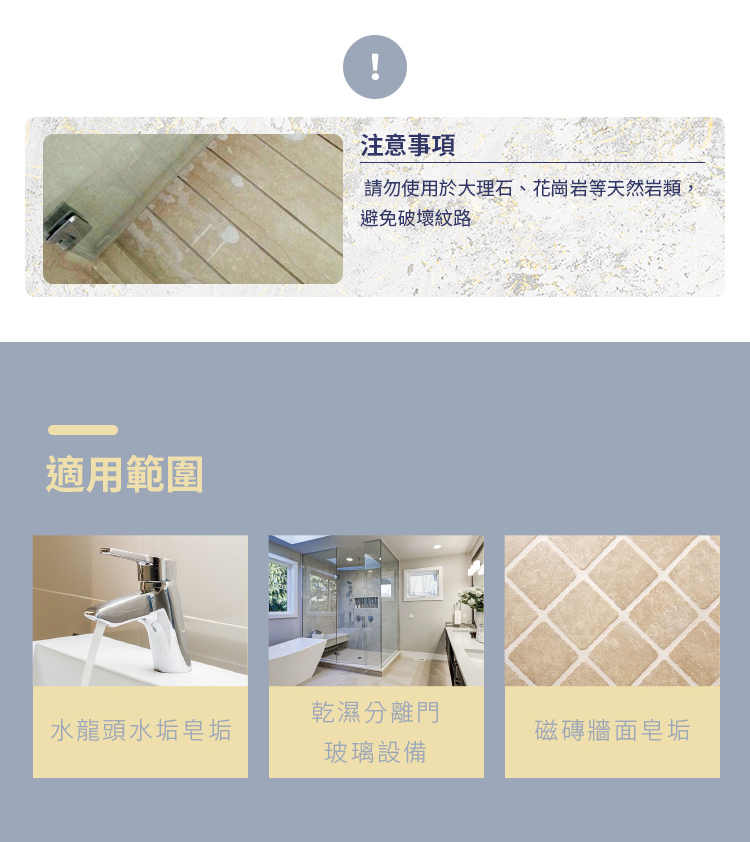 ►用途:浴廁水垢清潔。適用於乾濕分離玻璃、塑膠隔門、金屬水龍頭、浴室磁磚壁面、不鏽鋼洗手槽、浴缸等。
