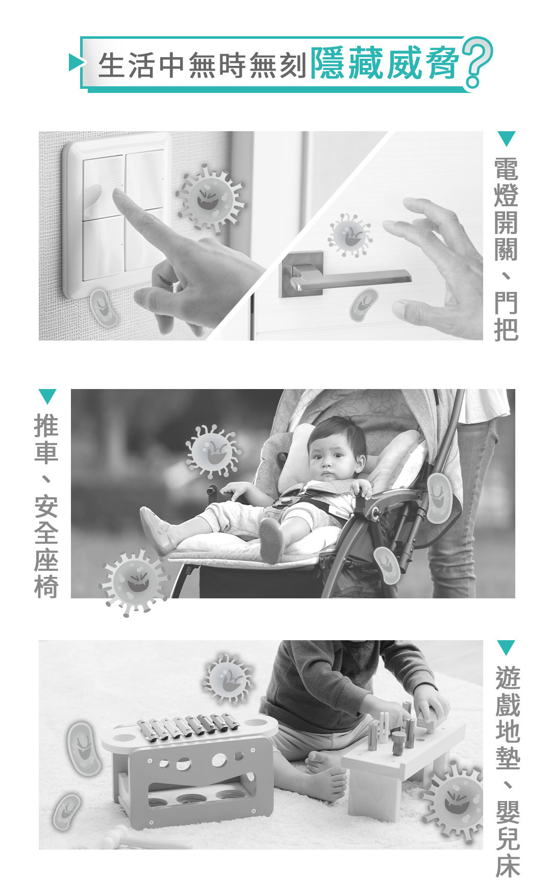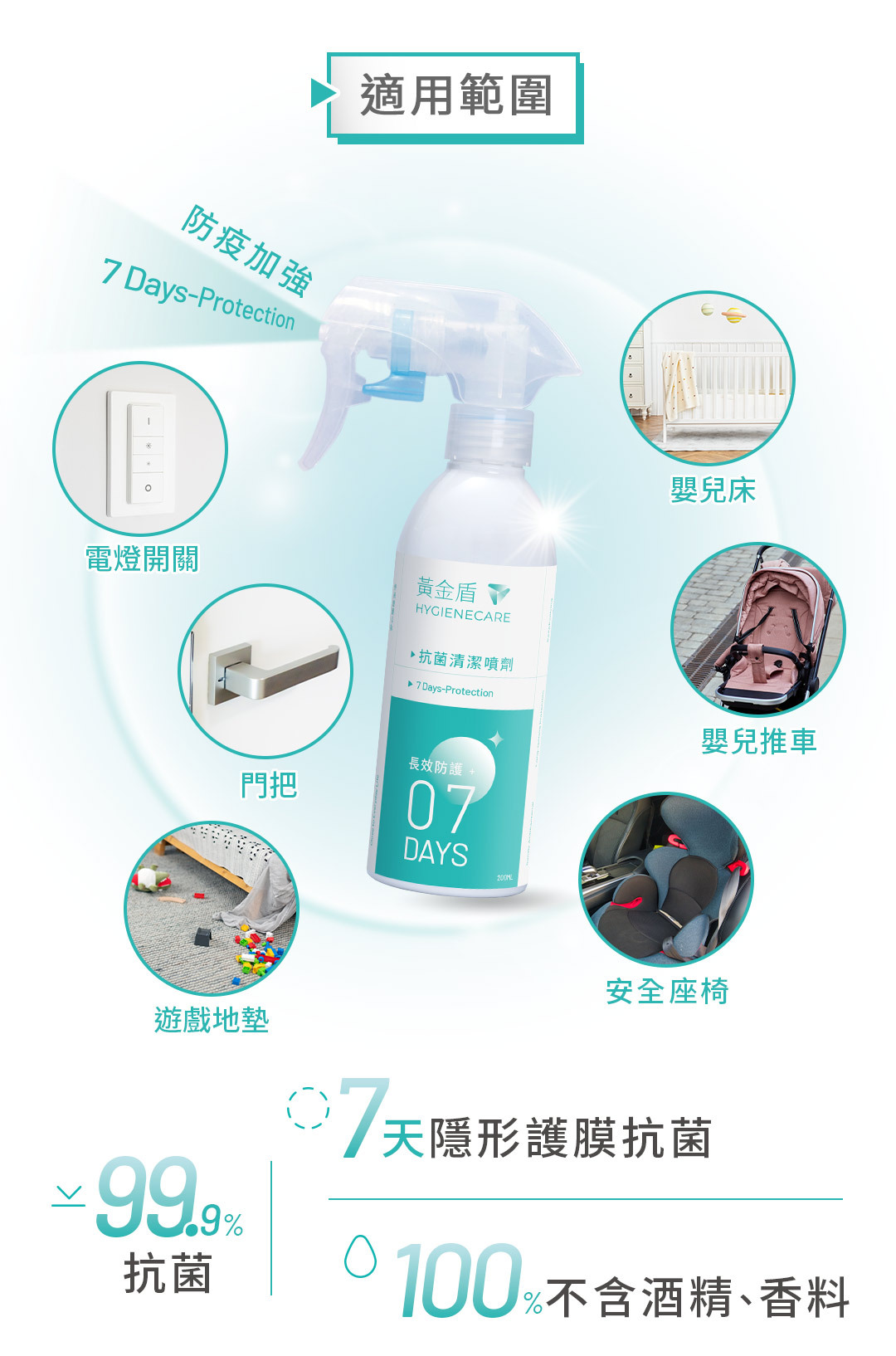 ►用途:環境、物品表面清潔,適用於桌面、EVA地墊、嬰兒推車、安全座椅、公廁尿布檯、瑜珈墊、門把、捷運...等。
