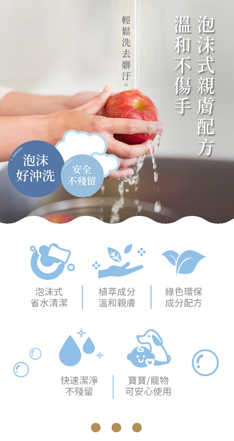 ⊙清洗嬰兒餐具:按壓適量泡沫於奶瓶刷或海棉上,將餐具清洗乾淨即可。