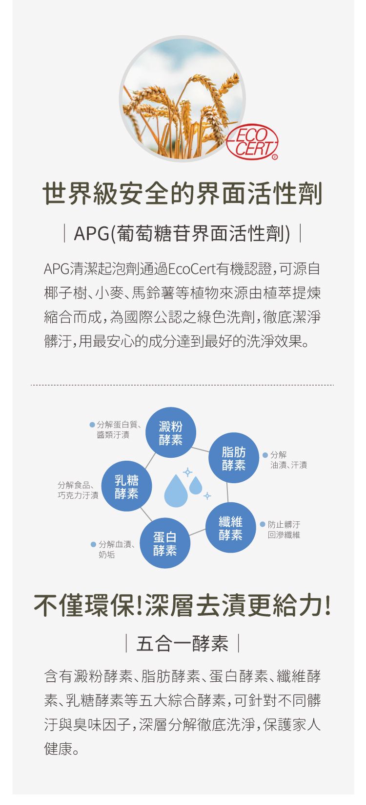 ►主要成分:去離子水、椰子油衍生物界面活性劑、葡萄糖苷界面活性劑(APG)、五合一酵素。
