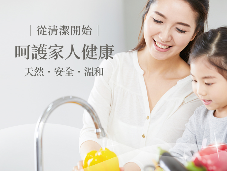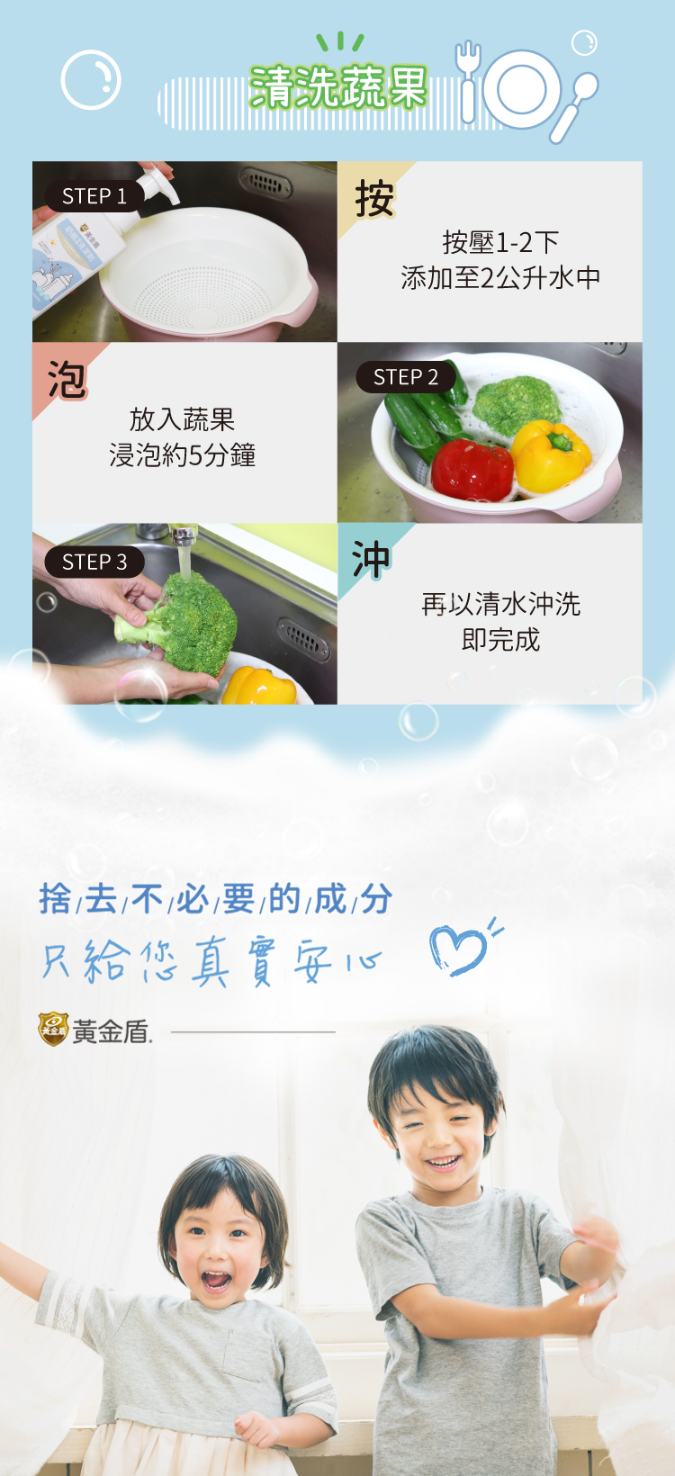 ⊙清洗蔬果:按壓1-2下,添加至2公升水中,將蔬果浸泡5分鐘後以清水洗淨。