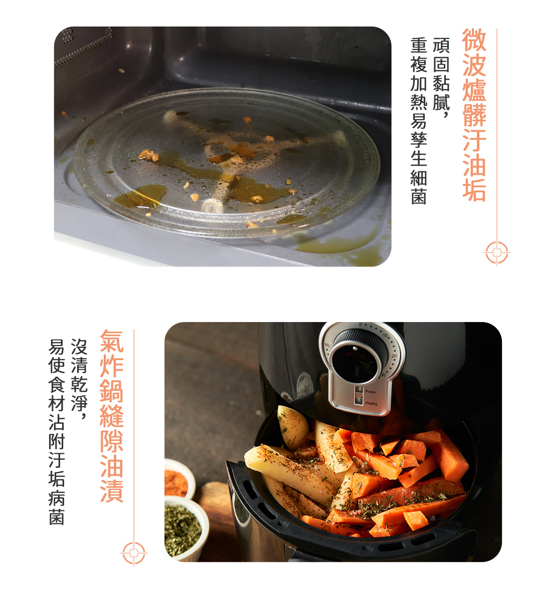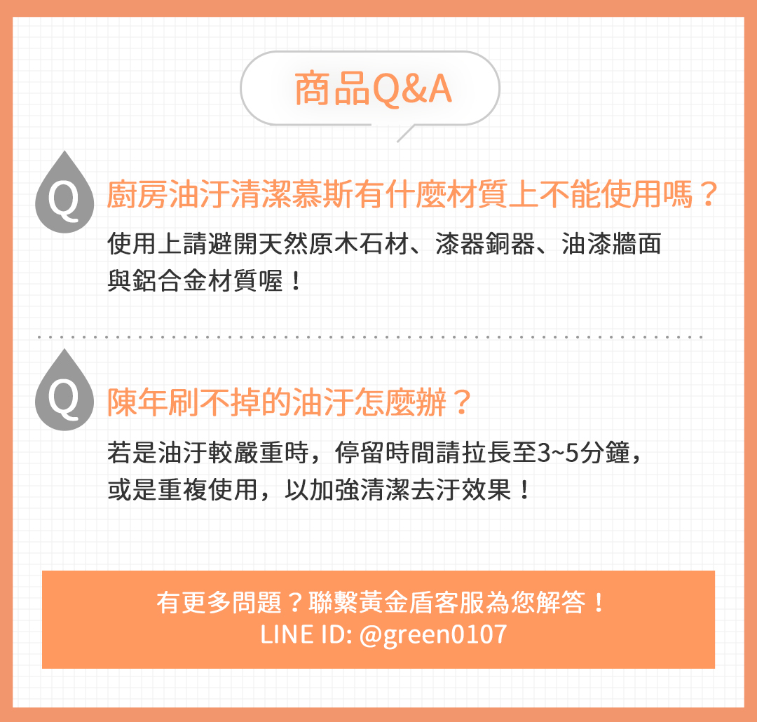 ►適用範圍:清除瓦斯爐周圍、流理臺、水槽周圍及廚房電器等油汙。可用於:微波爐、鑄鐵鍋、氣炸鍋、電陶爐、電鍋內層、烤盤、烤箱內壁,及磁磚與玻璃材質。