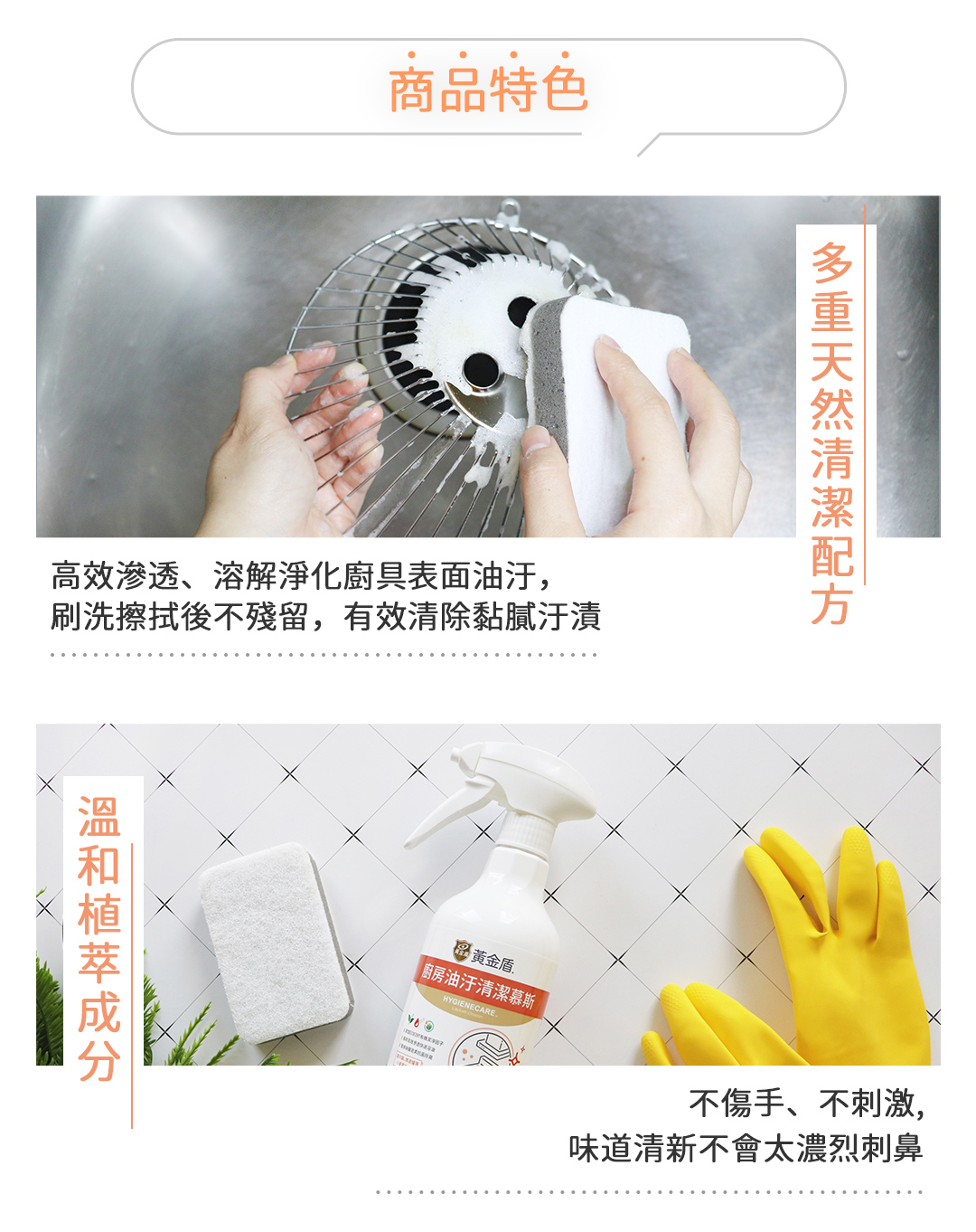 ►注意事項:1.使用前請先參考廚具產品之清潔指示以避免受損,建議先於不明顯處試噴,若無變色變質情形再使用 2.敏感膚質、有傷口或需長時間接觸,建議配戴手套使用 3.如不慎誤食或接觸眼睛,請立即以大量清水沖洗並盡速就醫。