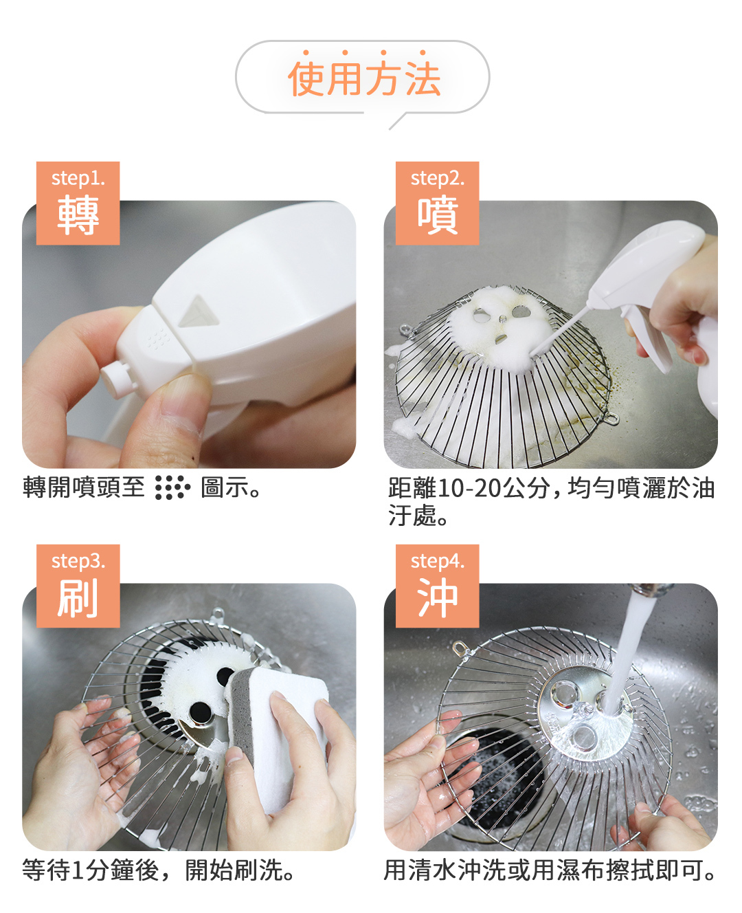 ►使用方法:距離10~20公分,酌量均勻噴灑於油汙髒污處,靜置約1分鐘,開始刷洗,再用水沖洗清除即可,亦可用濕布擦拭。若是油汙較嚴重時,請停留3~5分鐘,或重複使用,以加強清潔效果。