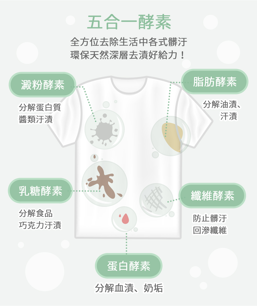 ✔添加五合一酵素,全方位去除油漬、汗漬、食品汙漬等