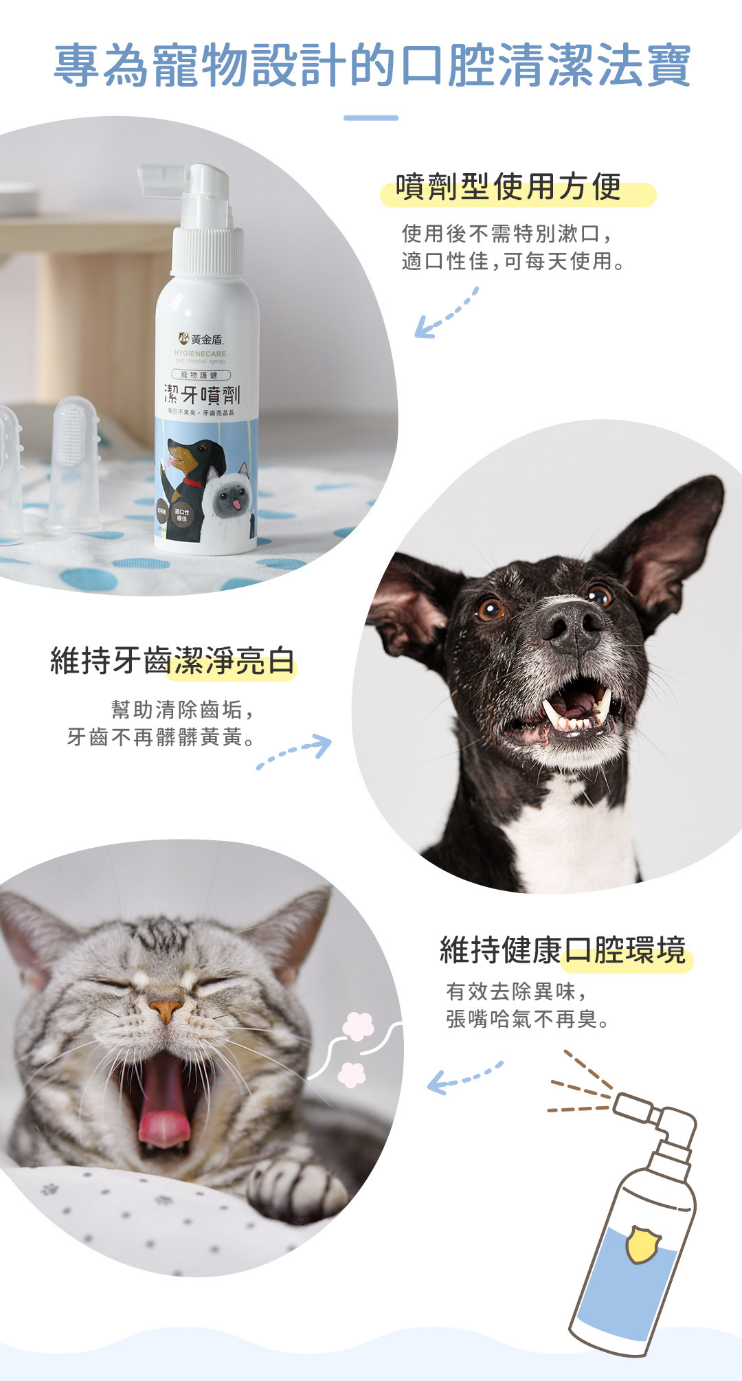 ►內容:黃金盾寵物護健潔牙噴劑(100ml) x1、黃金盾寵物天天潔牙水(250ml) x2