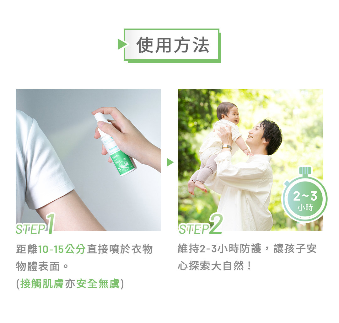 使用方法:距離10-15公分直接噴於衣物、物體表面上(接觸肌膚亦安全無虞)。建議間隔2-3小時再次使用,效果更佳。