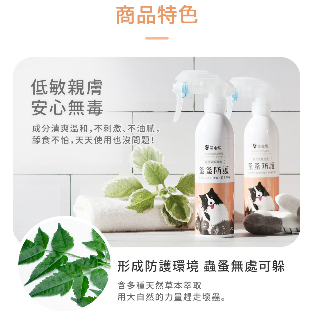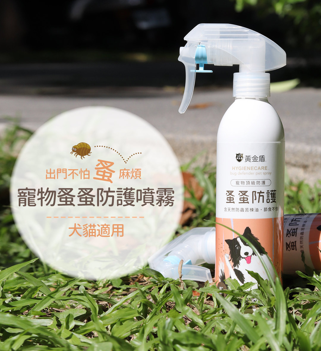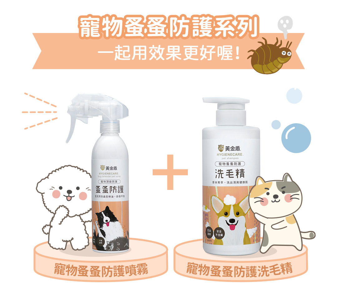 ►內容:黃金盾寵物蚤蚤防護噴霧250ml*1、黃金盾寵物蚤蚤防護洗毛精500ml*1