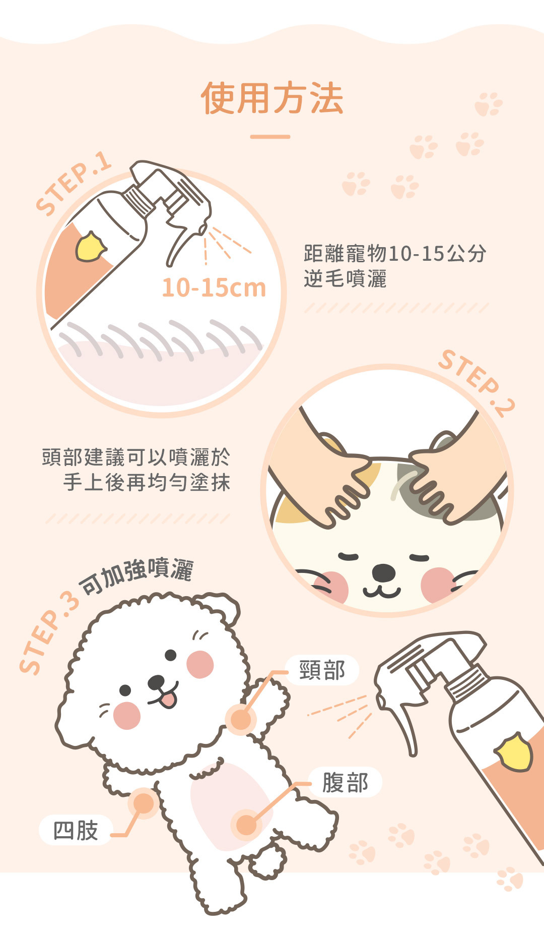 ►使用方法:使用前請先輕搖瓶身。距離寵物10~15公分逆毛均勻噴灑全身,避免接觸臉部及敏感部位。