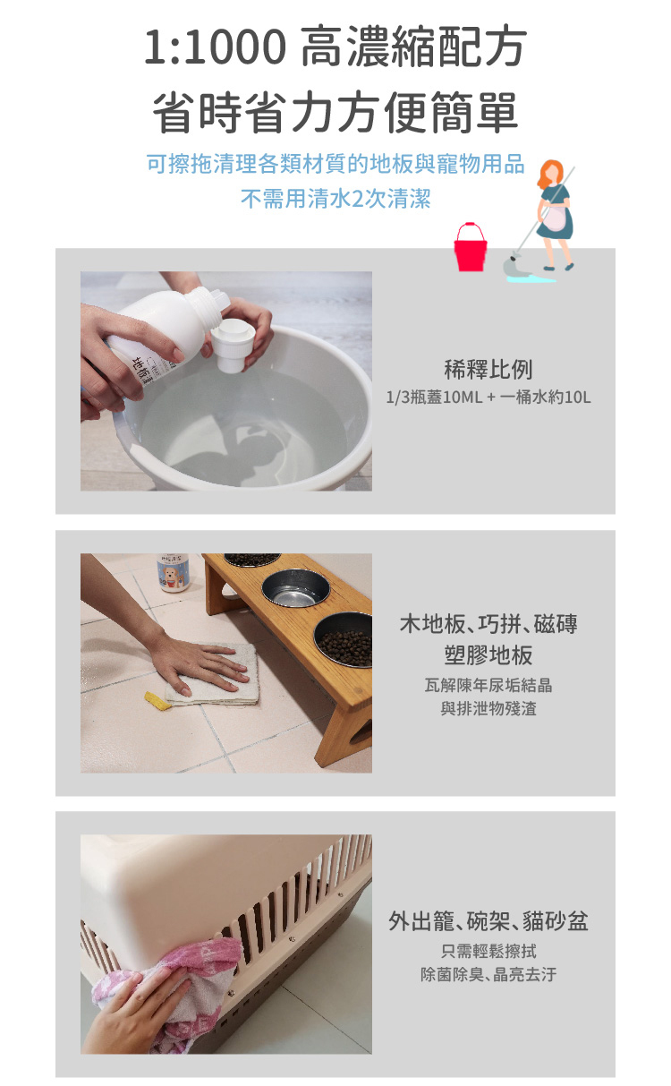 ►使用方法:本產品為濃縮清潔劑,請按稀釋比例1:1000稀釋使用,可用於拖地清潔或擦拭物品傢俱,使用後無須再用清水拖過。