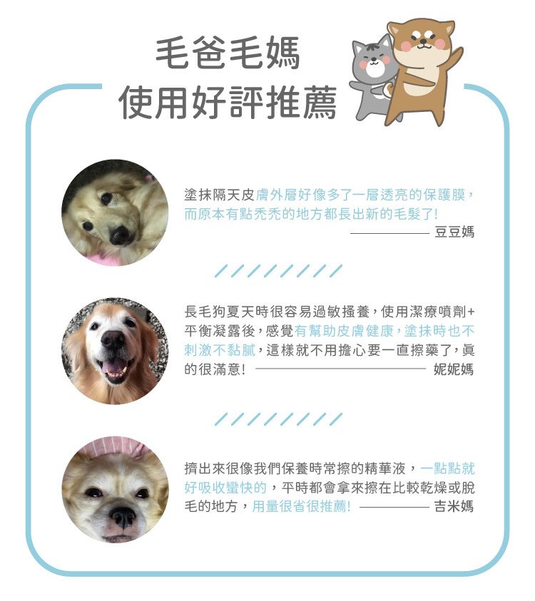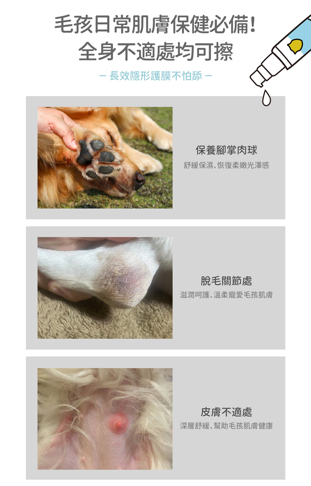 ►使用方法:適量塗抹於寵物皮膚乾燥敏感處,一天使用1次,幫助皮膚健康。建議可於潔療噴劑後使用。
