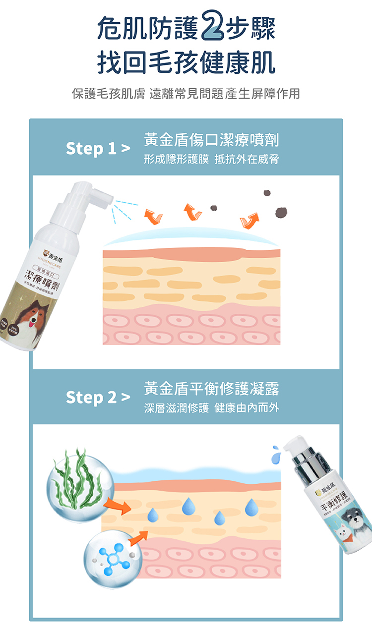 ►容量:黃金盾寵物傷口潔療噴劑(100ml) x1、黃金盾寵物平衡修護凝露(30ml) x1