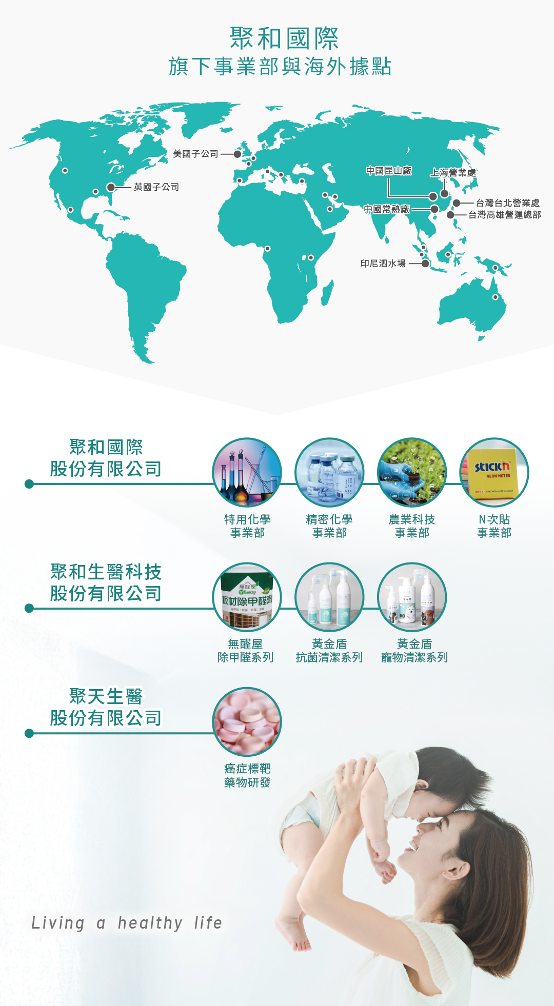 集團旗下擁有多個知名消費性品牌,無醛屋 GreenKey®、黃金盾 Hygienecare® 及 黃金盾寵物,致力於打造無甲醛、無病菌的安心生活圈,守護家庭每一位成員的健康。